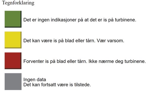 Utvis alltid forsiktighet når du beveger deg i vindparken om vinteren. Fargevarselet under antyder risiko, men det er alltid en fare for iskast, selv om varselet viser grønt. Pass på å lese teksten under fargevarselet.